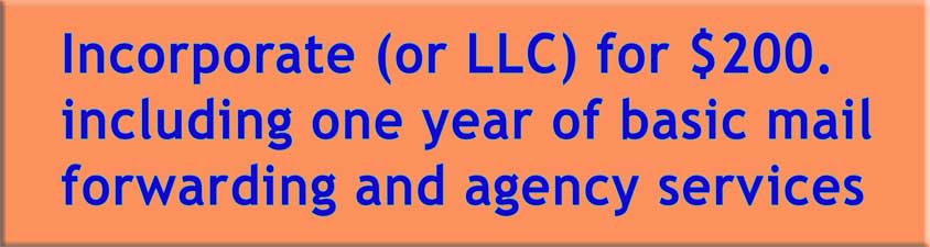 We can show you how to set up a new corporation or LLC in a friendly state for a total of $200., which includes a business address, one year of basic mail forwarding and local agency representation. Thereafter, the yearly renewal is roughly half that much.